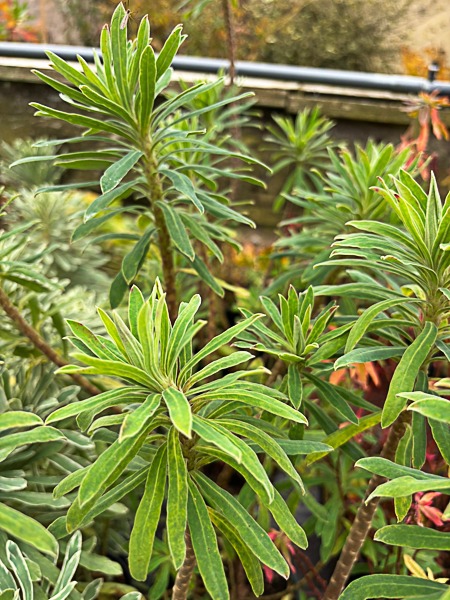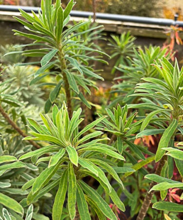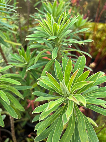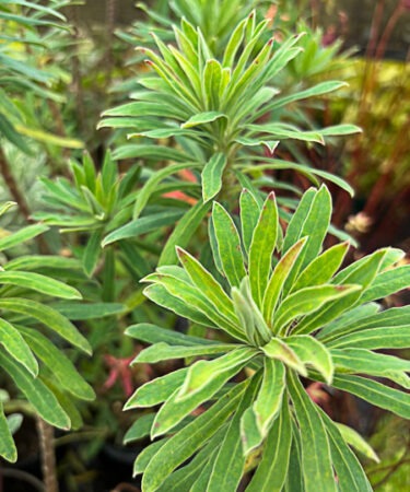 Short dense evergreen. Grey green foliage. Heads of yellow-green flowers. Flws: Feb-Jun. Ht 2ft. Sun or part shade. Moist, but well drained soil.