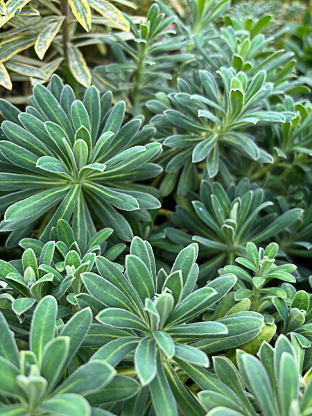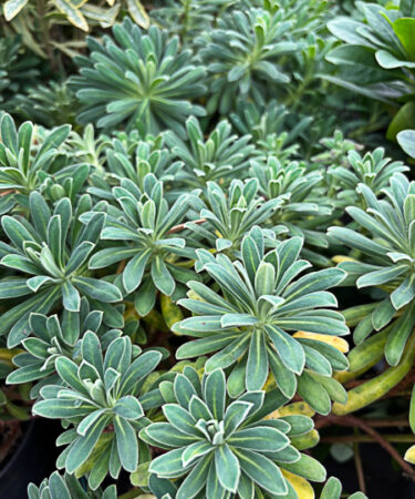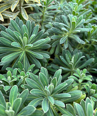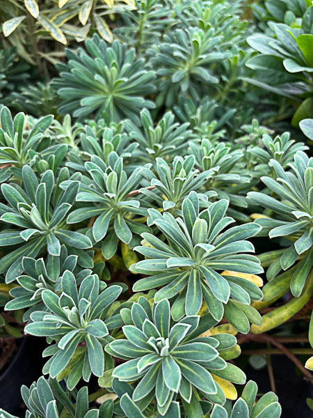 A distinctive variety of Euphorbia Characias. Tall evergreen blue grey velevty foliage. Large dome shaped heads of lime yellow flws. Flws: May-Jun. Ht 4-5ft. Well drained, sun.