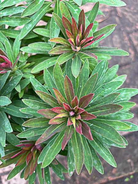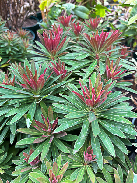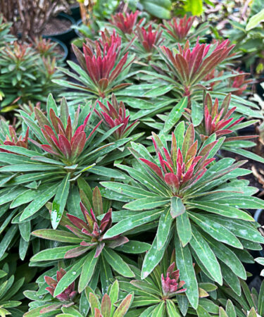 A superb euphorbia. Compact clump of lime green foliage, new growth flushes orange. Heads of green/ yellow flws, with dark eye. Flws: Mar-Jun. Ht 12″. Deer resistant. Good for cut flowers. Sun or part shade. Moist, but well drained soil.