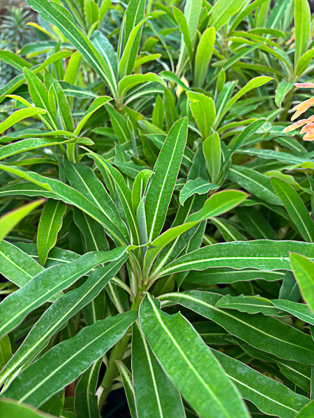 Striking bright green foliage with yellow veining. Large honey scented yellow bracts. Flws, May-Jul. Ht 4ft. AGM. Warm, well drained sheltered site.