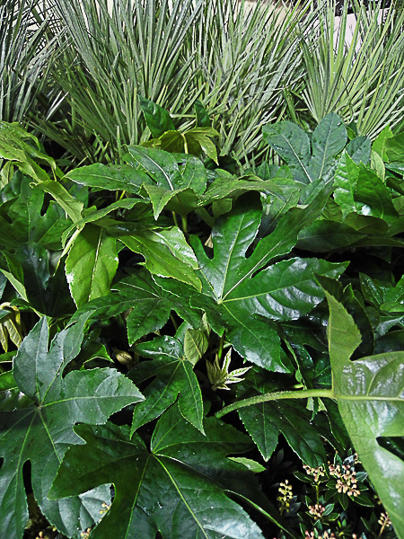 A lovely spreading foliage shrub. Very large bright glossy green rounded fingered foliage radiating from a central stem. Panicles of creamy white flowers. Flws: Sep-Oct. Ht 4ft. Sheltered, semi shade or sun. Excellent for seaside gardens.