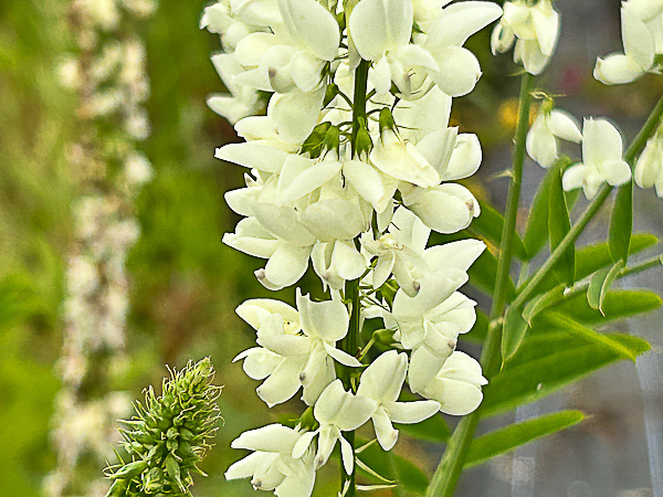An old cottage garden plant. Erect stems of fresh green pinnate foliage. Terminal spikes of white pea flws. Flws: Jun-Aug. Ht 4ft. Well drained soil. Sun.