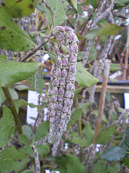 Evergreen dense shrub. Wavy edged leathery dark green foliage. Attractive long grey green catkins. Flws, Nov-Mar. Ht 8ft. South or West wall. Sunny site, well drained soil.