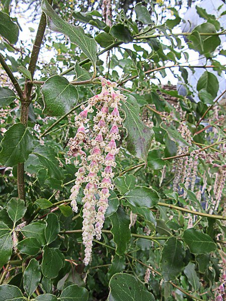 Evergreen dense shrub. Wavy edged leathery dark green foliage. Attractive long grey green catkins. Flws, Nov-Mar. Ht 8ft. South or West wall. Sunny site, well drained soil.