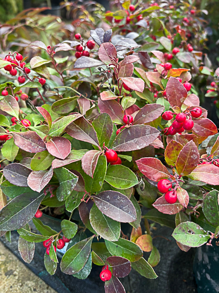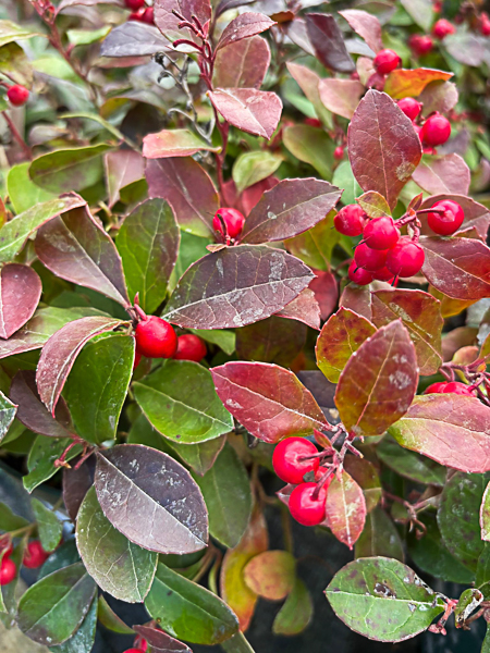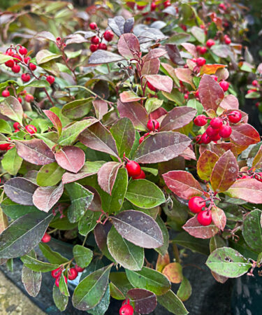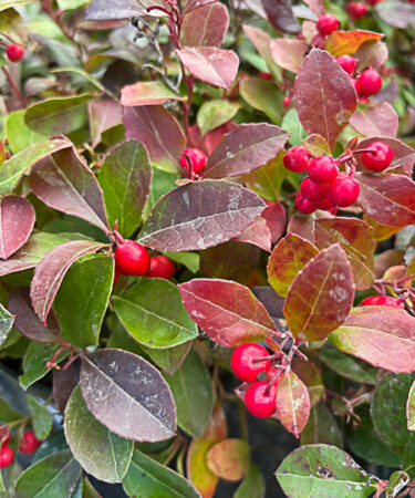 ‘Teaberry’. Groundcovering evergreen. Small dark glossy grren leaves. White urn-shaped flws, Jul-Aug. Bright red berries. Ht 3-6″. Leaves used for tea. Moist, acid soil, partial shade.