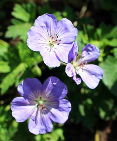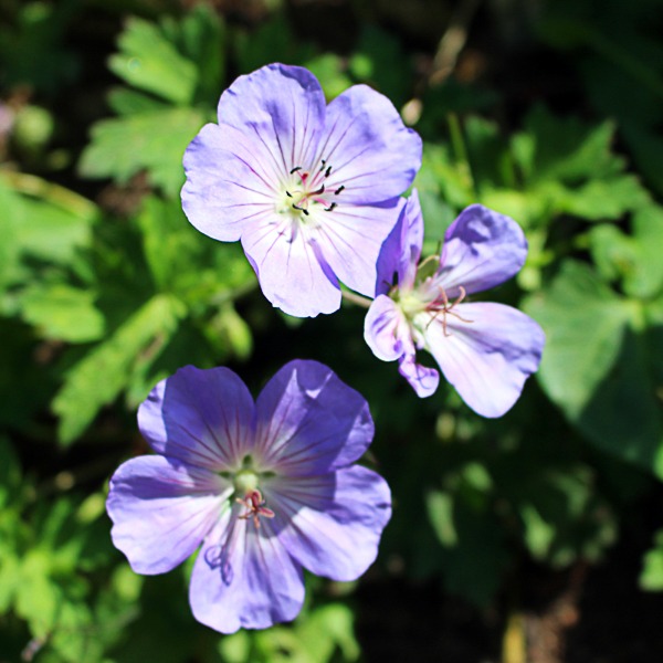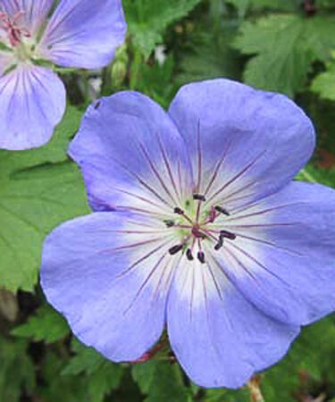 Compact sport of Geranium Rozanne 35cm high. Blue flowers with white centres May- Oct. Full sun or part shade.