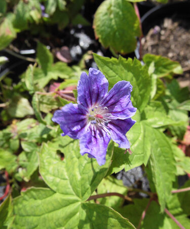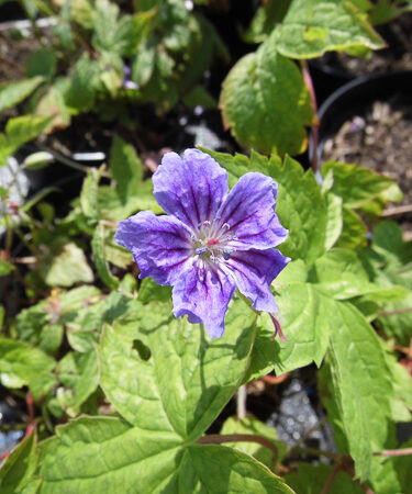 Purple flowers with white edge, May-Sept. Glossy, maple shaped leaves. Ht. 25cm. Sp. 35cm. Shade or sun . Any soil.
