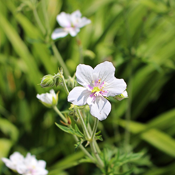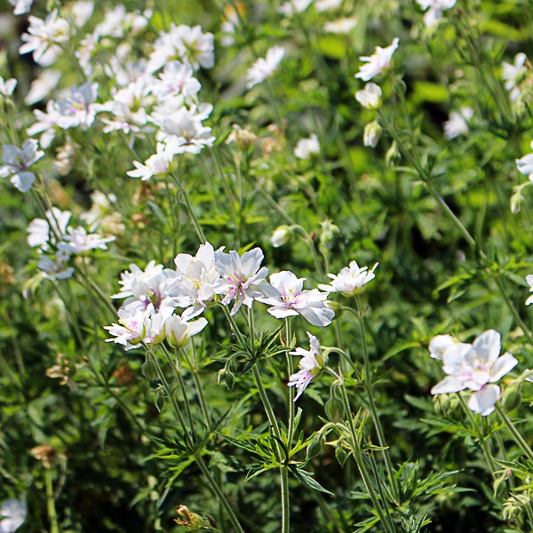 Rare, compact pratense with unusual double white flws and purple heart. Attractive foliage. Flws: Jun-Jul. Ht 18″ (45cm). Well drained soil. Sun to part shade.