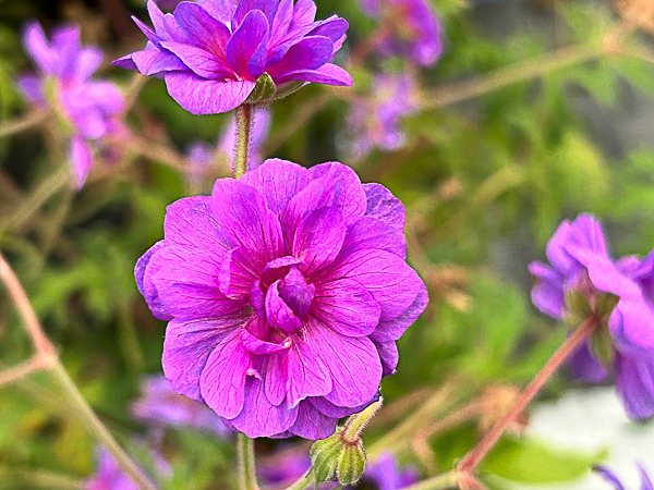 A rare and choice perennial. Attractive rounded fingered foliage, tinted in autumn. Masses of fully double violet blue rosettes. Flws: Jun- Aug. Ht 2-3ft. AGM. Well drained fertile soil. Sun, part shade.