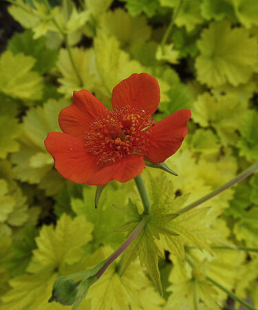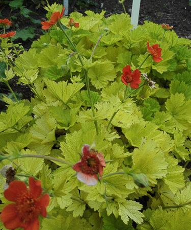 Buttercup yellow spring foliage gradually turns lime-green. Bright orange flowers make a startling unusual contrast. Good vigorous habit.