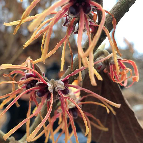 Hamamelis intermedia ‘Aurora’ AGM A seedling from ‘Vesna’. Upright habit with large strongly fragranced, bronze-yellow flowers, shading from red at the base to yellow at the tips of the petals. Good autumn colour. AGM.