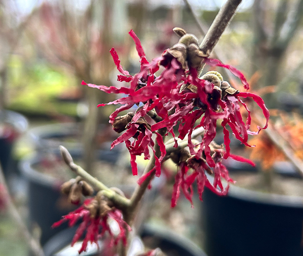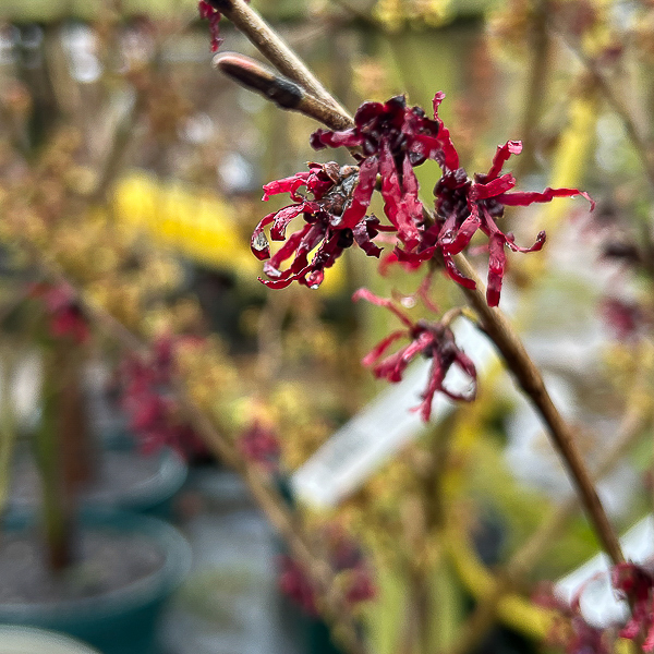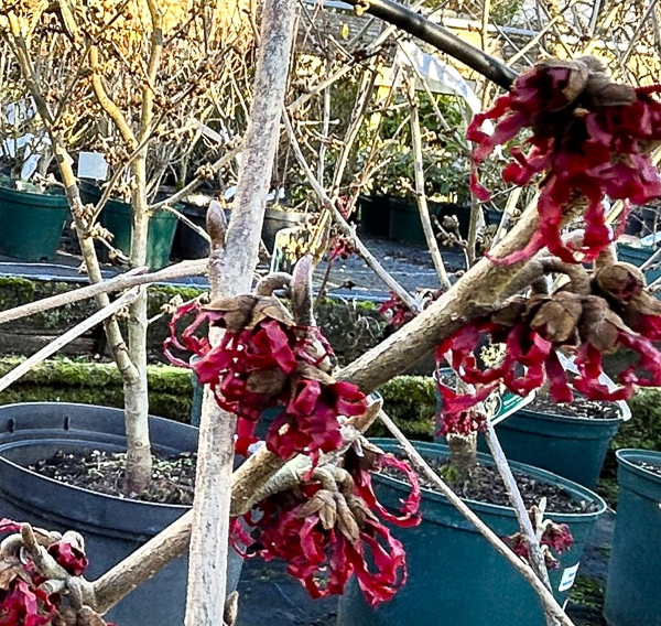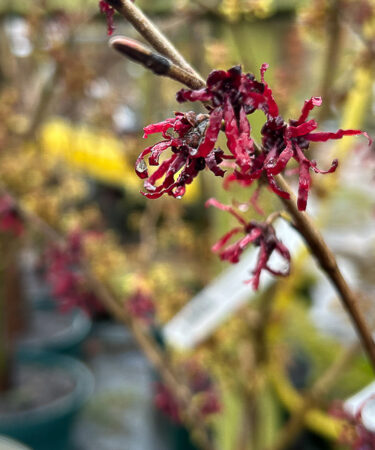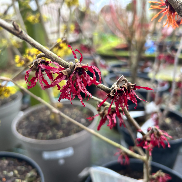 A medium sized choice deciduous shrub with dark rich red slightly scented flowers produced along the naked stems in January and February, and excellent autumn tints. Hazel like felted grey green foliage. Ht 6 ft in 10 years. Well drained, acid soil, part shade.