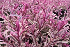 A compact, upright, bushy, evergreen shrub bearing elliptic to oblong, grey-green leaves with pale pink margins, darker pink when young, and racemes of pale purple flowers in summer. Ht and spr 30cm (1ft). Any well drained soil, sun/ part shade.