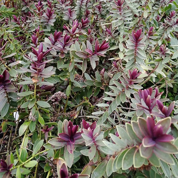 Colourful red tips to evergreen blue grey oblong foliage. Neat rounded growth. Clusters of pink flowers. Flws: Jun-Jul. Ht 18″. Well drained soil, sun.