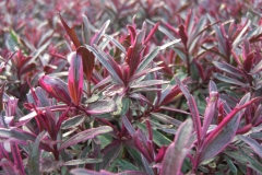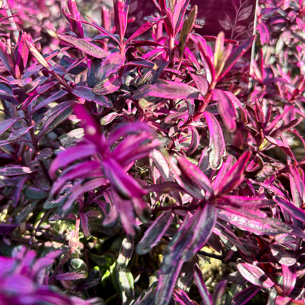 Small green and white leaves with purple growing tips in winter and spring. As the weather turns colder the purple colour of the Hebe intensifies. Well drained soil. Sunny position.