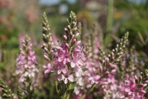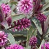 Excellent dwarf evergreen hebe with a profusion of pink flowers from June right through until the first frosts.Ht 35cms spread 35cms. Well drained soil.