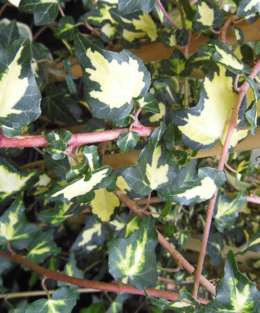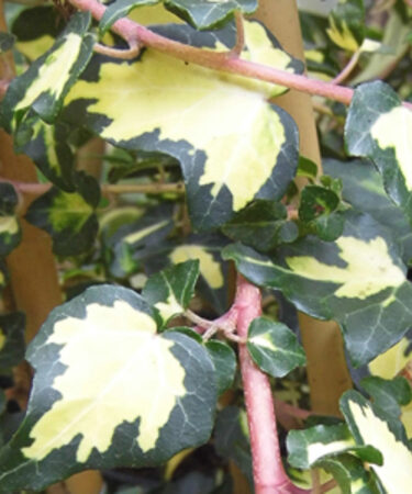 Hedera helix ‘Goldheart’ (oro di bogliasco) vVigorous, evergreen, climber or trailing perennial. Dark green leaves with bright yellow centres. Slow to establish, grows rapidly. Not suitable for ground cover. Ht 15ft. Sun/shade and well drained soil.