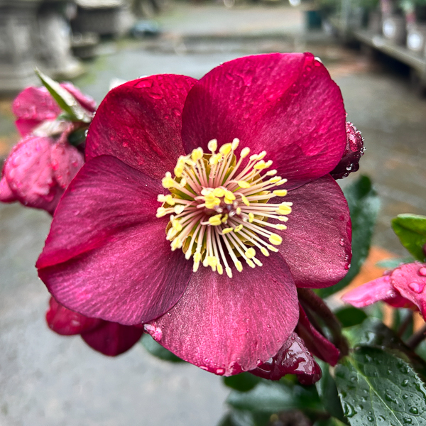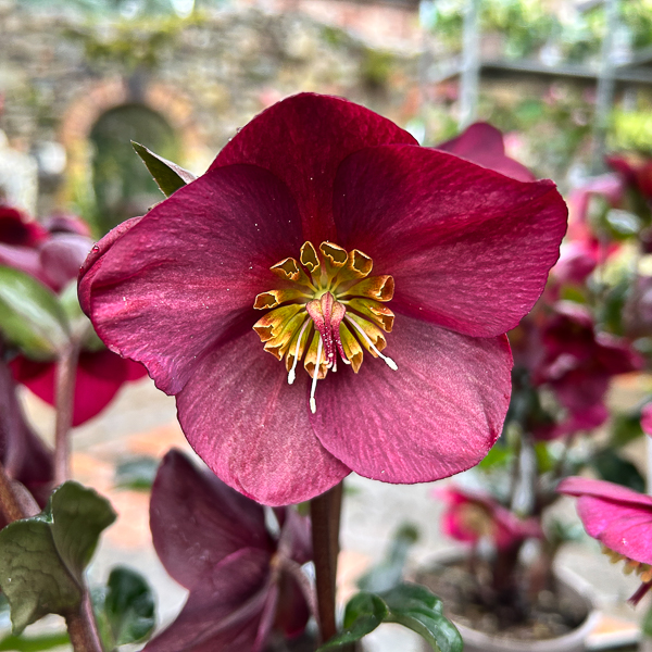 Evergreen perennial flowering from January. Raspberry coloured blooms. Ht and Spr 60cm x 50cm. Attracts bees. Prefers normal, well-drained soil and a partially shady spot. Remove faded, damaged or dead foliage when the flowers appear. Cut back spent flower stems.