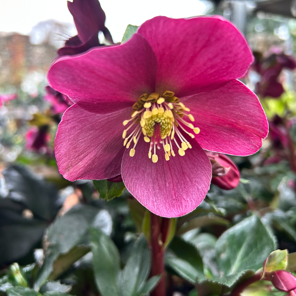 Helleborus Ice n’ Roses red’. Evergreen perennial producing outward-facing,single, rich ruby red flowers with contrasting creamy stamens borne on tall stems over a long period through winter. Flws: Dec-Mar. Ht and Spr 40cm. Prefers normal, well-drained soil and a partially shady spot. Remove faded, damaged or dead foliage when the flowers appear. Cut back spent flower stems.