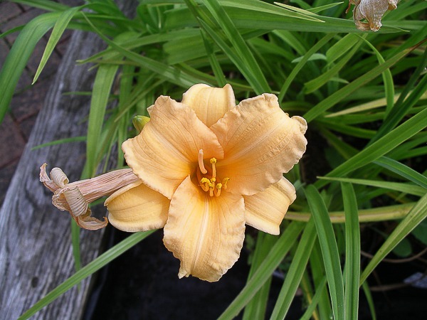 Short arching compact clumps. Narrow foliage. Wide apricot ruffled trumpets. Flws: Jun-Aug. Ht 18″. Well drained moist soil. Sun.