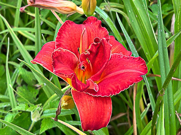 Giant 6″ double, reblooming flws. Deep rich red flws with delicate gold edging to petals and green throat. Flws: Jul. Ht 2ft (60cm). Well drained soil. Sun or part shade.