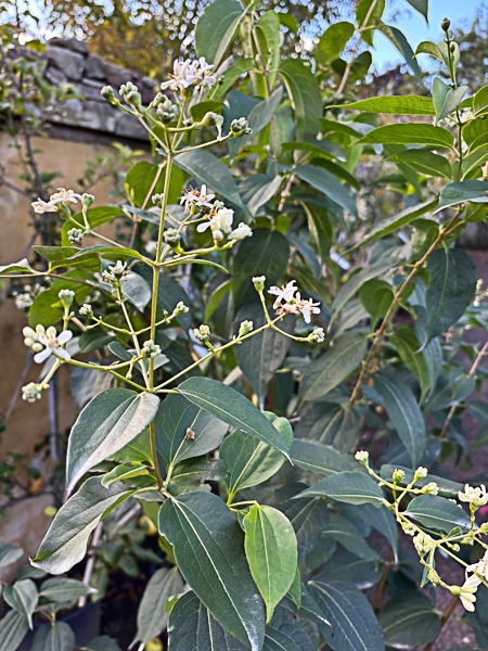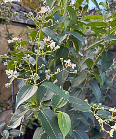 Deciduous Chinese shrub related to Abelia. Upright habit, peeling bark. Snow white blossom covers the plant, late summer. In good weather, as the flws fade, brilliant red sepals elongate on the fruits and last well into autumn. Good autumn colouring reds/purples. Ht 12ft. Well drained soil, sunny position.