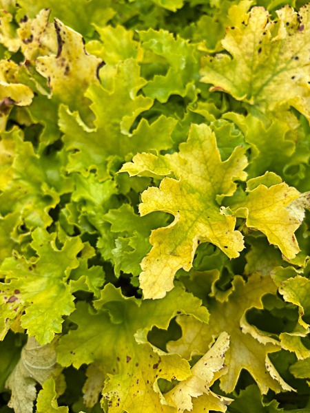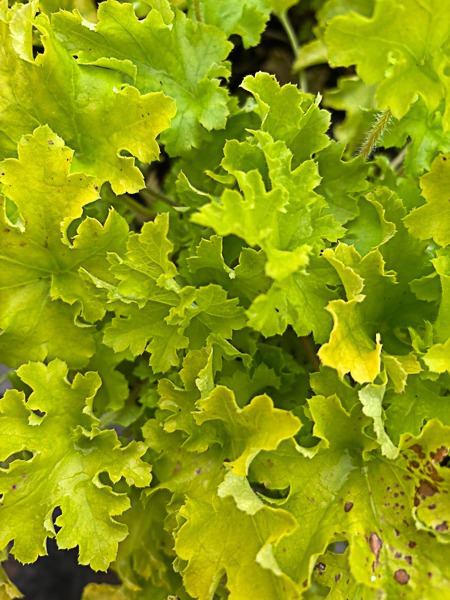 Clumps of very frilly dense lime-green foliage. A sport of ‘Marmalde’ with the same habit. Unlike other lime heucheras this will tolerate some morning sun but needs shade from the mid-day sun. Much stronger habit than other lime colours. White flws on tall stems, Summer. Ht 30cm x Spr 45cm. Moist but well drained soil. Sun/ part shade.