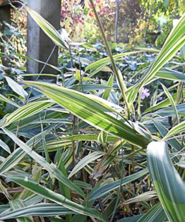 A spectacular bamboo. Long variegated gold and green foliage, tall arching growth. Ht 5ft. Lovely as a specimen or in a container. Sun or part shade.