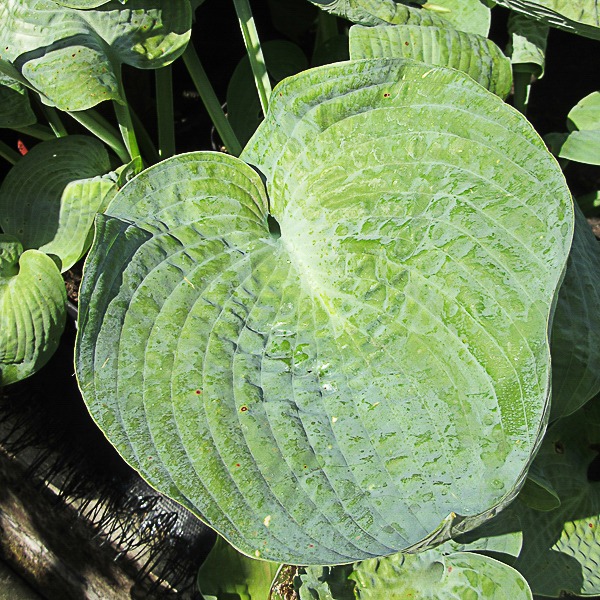 Heavily textured, huge blue-green leaves cup and twist into a unique display. Especially attractive after a rain when small pools of water collect in the deeply cupped foliage. White flowers in early summer. Good slug resistance. Ht 22″ x Spr 46″. Part shade/ shade. Moist soil.