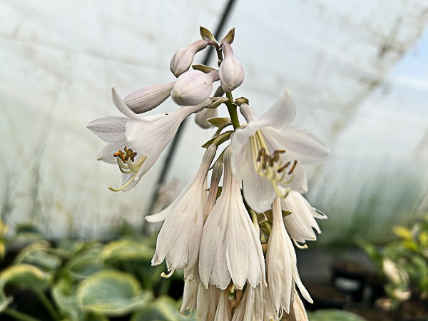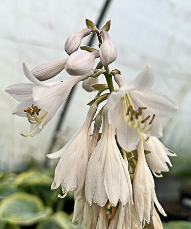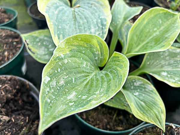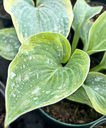 Large sport of H.Northern Halo with dark blue green leaves with wide cream white margins. White flowers. Ht 150cm x 60cm. Part shade. Humus rich soil.