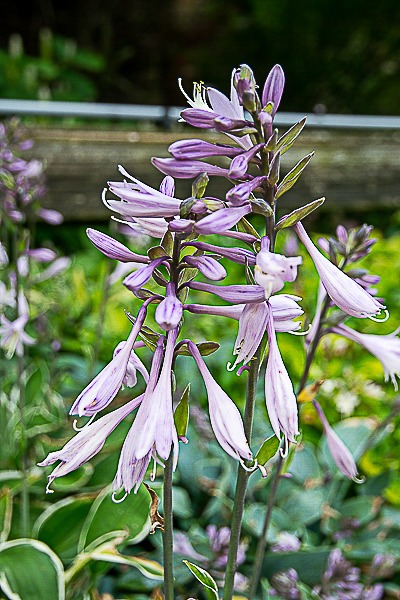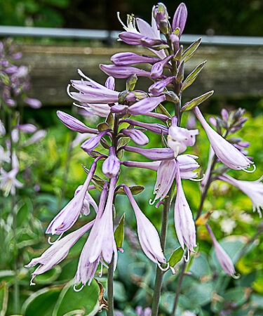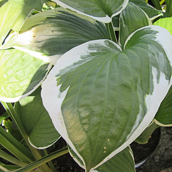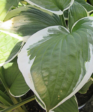 Large, broad, spreading hosta. Slightly- cupped heart shaped leaves. Dark green flame shaped centres with white margins. Pale lavender-striped flws. Ht 2ft, Spr 4ft.