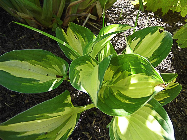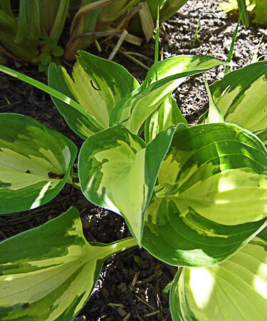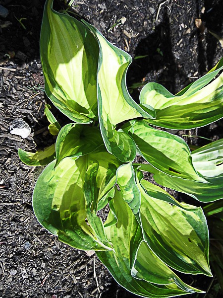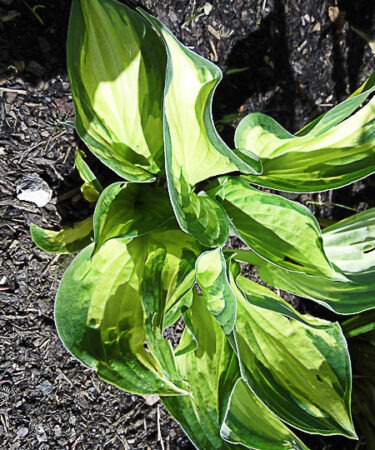 Thick, golden heart shaped leaves with irregular green margins. A reverse of ‘twilight’. Pale lavender flowers. Ht 75cm x 60cm. Moist soil. Part shade.