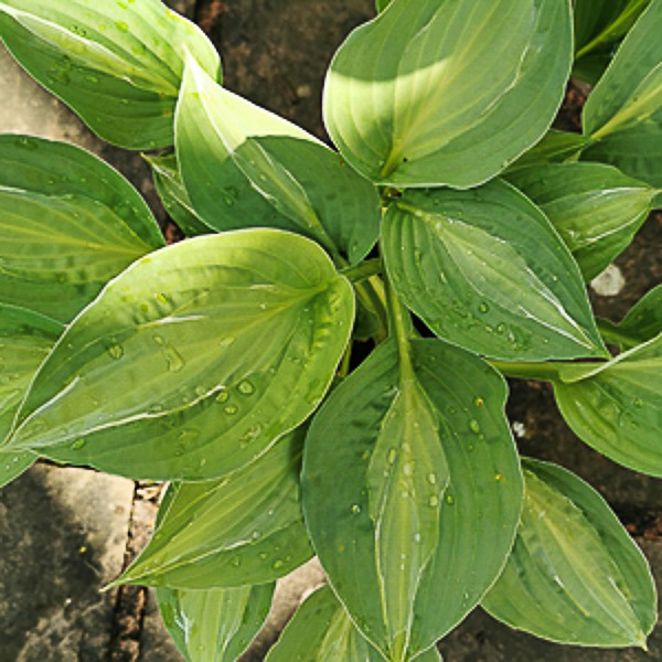 Medium sized hosta. Heart shaped leaves. Broad dark green margins, central yellow splash. Sometimes white striations. Ht 16″ x spr 20″.