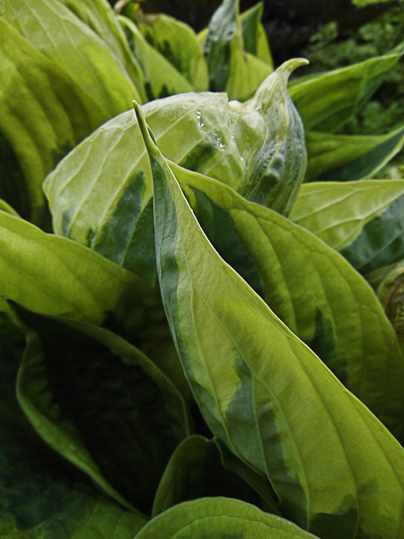 New variety. Large dark green leaves with good substance, broadly margined with golden yellow and with white flws.Ht 18″. Retentative soil. Sun/part shade.