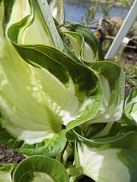 Heart shaped leaves have white centres and dark green margins, are slightly twisted and curved, and held upright on stiff petioles, forming a tight mound. The leaf centre can change through the season, depending on sun exposure, from creamy to bright white to light green. ‘Whirlwind’ has unusual dark green veins, which contrast with the bright white centre. A vigorous grower with good substance; slug resistant. A wonderful hosta! Ht 20″ x Spr 40″. Part shade/ shade. Moist soil.