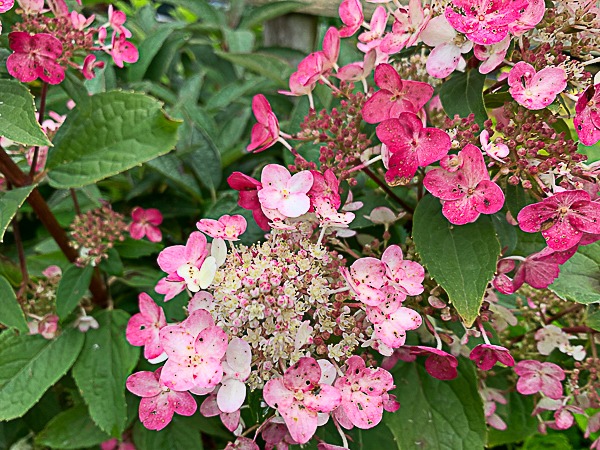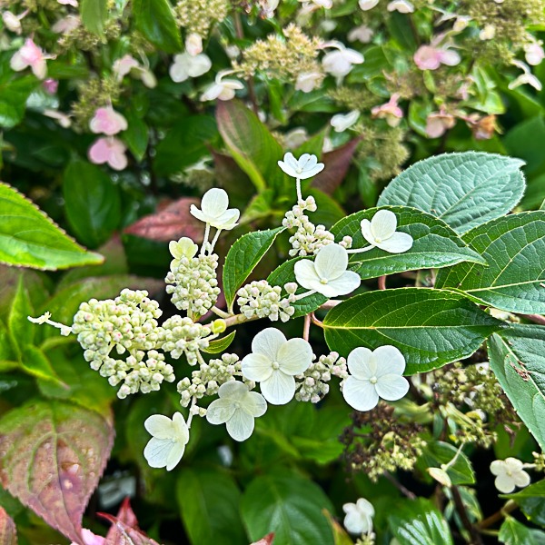 Hydrangea panic. ‘Early Harry’ is a upright to rounded, deciduous shrub with conical bunches of small creamy-white flowers and large white flowers that turn pink with age. Blooms from early summer into autumn. Ht 1.75m x spr 1.5m. Full sun/part shade. Prefers acid-neutral, moist but well drained soil.