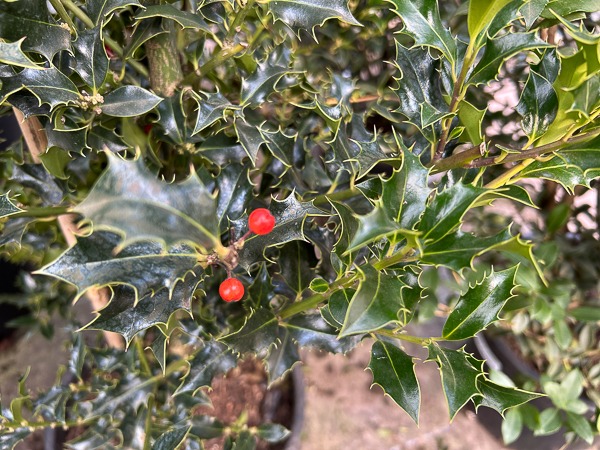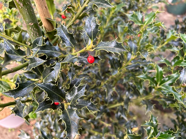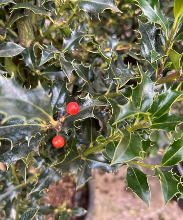 Evergreen. Glossy, dark green, spiny leaves. Compact growth. Female. Red berries. Slow growing. Self fertile, but bigger berries produced when male present. Any reasonable soil. Sun or part shade.