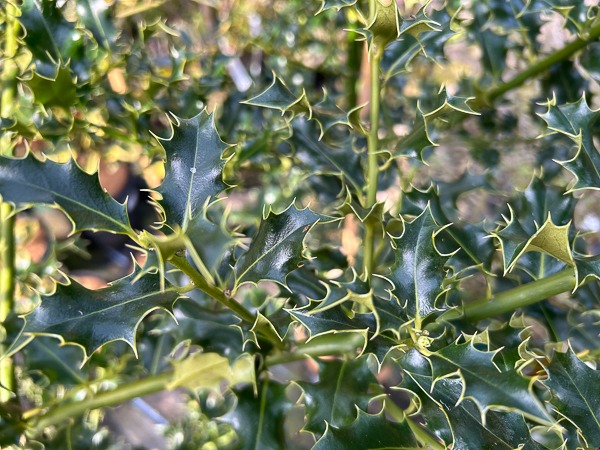 A good selection and male pollinator. Evergreen. Glossy, dark green, very spiny leaves. Compact growth. Any reasonable soil. Sun or part shade.