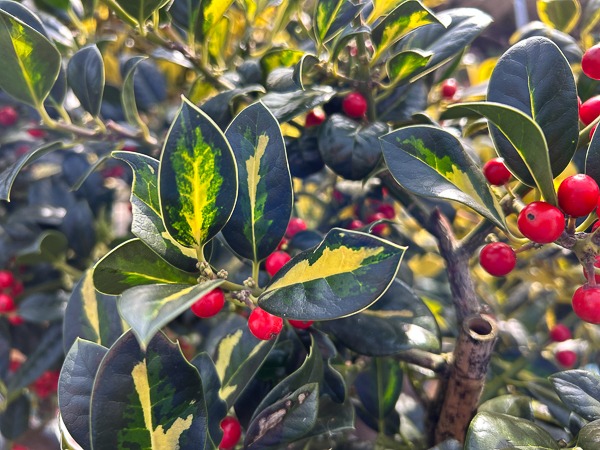 A striking and most ornamental holly grown on a short stem. Attractive spiny dark green leaves with a large central golden splash. Evergreen. Slow growing. Female. Red berries. Plant with male pollinator for berry production.