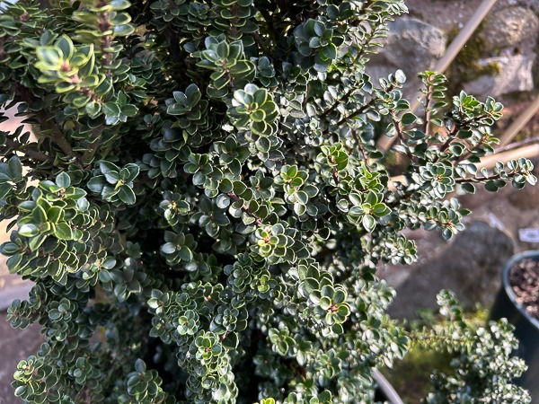 A very attractive slow growing evergreen shrub, only reaching around 2 ft (0.6 m) in 10 years. (A 25 year-old plant is 5 ft tall). Very compact, dense, rounded, irregular horizontal branching. Leaves alternate, simple, small, rounded, very short internodes. Idealfor bonsai. Sun to light shade.