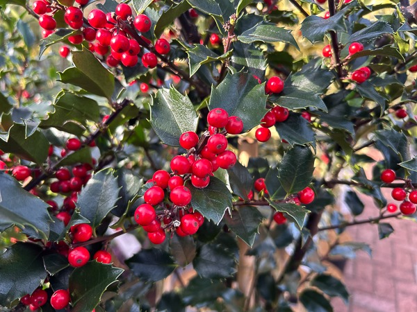 ‘Blue holly’. The female form with bluish-green leaves and brilliant glossy red berries in winter. Plant with male for berries. Excellent for pot culture. Any reasonably soil. Sun or part shade.