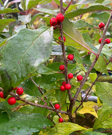 A female winterberry. A compact, slow-growing, deciduous, multi-stemmed, suckering shrub with an upright-rounded habit. Lustrous dark green leaves (to 3” long) turn yellow-bronze in autumn. Ht 5-7ft. Needs male to pollinate. Profuse crops of bright red berries. The showy berries will persist throughout the winter (hence the common name) and often to early spring.