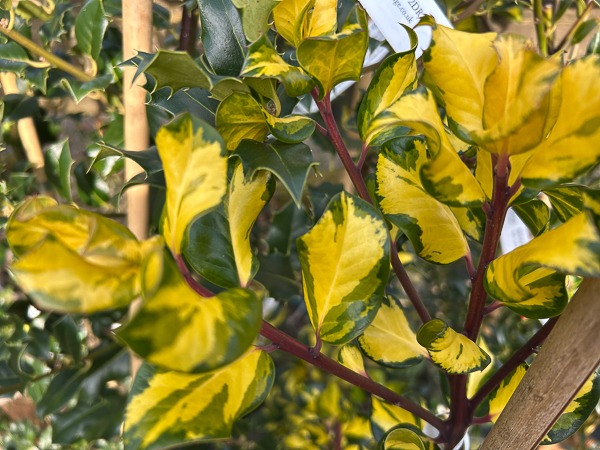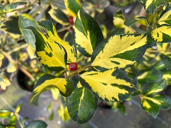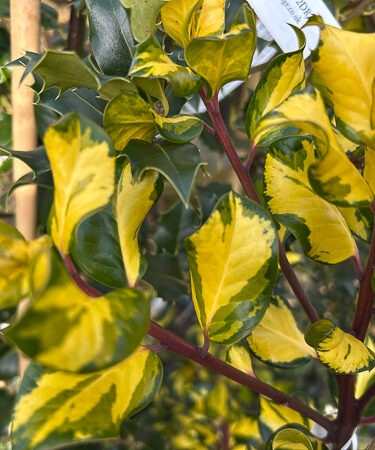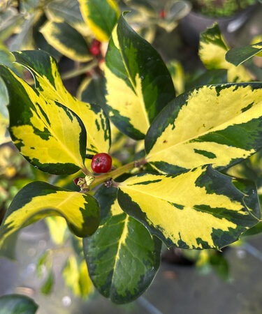 A bushy, female, evergreen holly bearing glossy, twisted, dark green leaves with golden-yellow centres. A selection from ‘Golden King’. Clusters of insignificant, dull white flowers are produced in spring or summer followed by red berries in late summer/autumn. Ht 3m. Needs a male pollinator. Any reasonable soil. Sun or part shade.