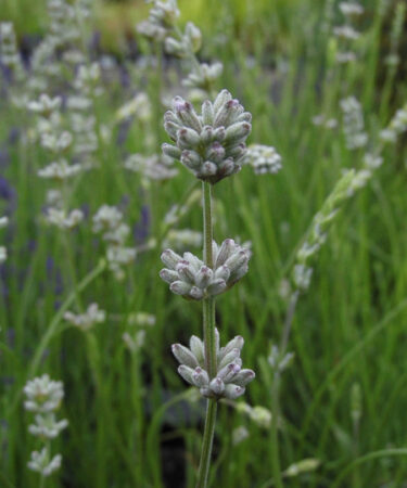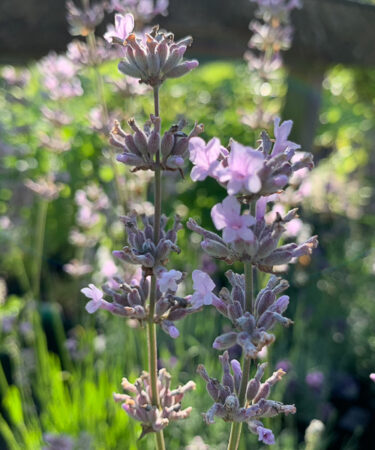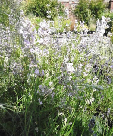 ‘English lavender’. The pink flowered form. Evergreen bushy shrub. Ht 3ft. Aromatic grey green leaves. Long spikes of fragrant pink flws. Flws: Jul-Sept. Culinary use: add flws to soups, stews and salads. Well drained soil. Sunny position.
