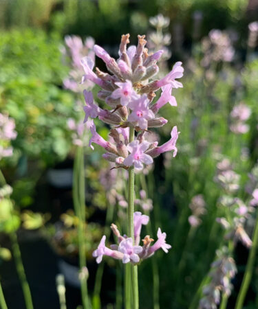 ‘English lavender’. The pink flowered form. Evergreen bushy shrub. Ht 3ft. Aromatic grey green leaves. Long spikes of fragrant pink flws. Flws: Jul-Sept. Culinary use: add flws to soups, stews and salads. Well drained soil. Sunny position.