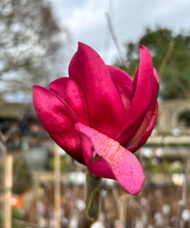 Spectrum x Vulcan. A NZ hybrid with vibrant red blooms in the shape of a large star. Flowers for a long period in early spring. Develops into an upright columnar tree. Plant in a sheltered position in acid soil for best results. Deciduous. Grows to estimated H 5m x W 3m in 10 yrs