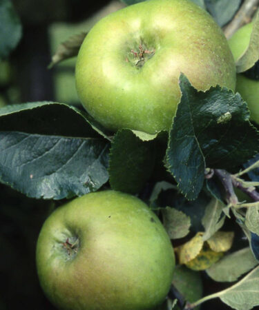 A compact version of Bramley Seedling- 20% less vigorous. Highly recommended. One of the richest apples in vitamin C content. An abundance of large green fruits are produced biennially. Good keeper Well drained, sheltered, sunny site. Triploid: needs two pollinators. Semi vigorous rootstock: Ht 3m metres in 10 years. Grown on M116- a new rootstock similar to MM106 but produces a slightly smaller tree (although larger than M26). It was developed in the 1960s from MM106 crossed with M27.