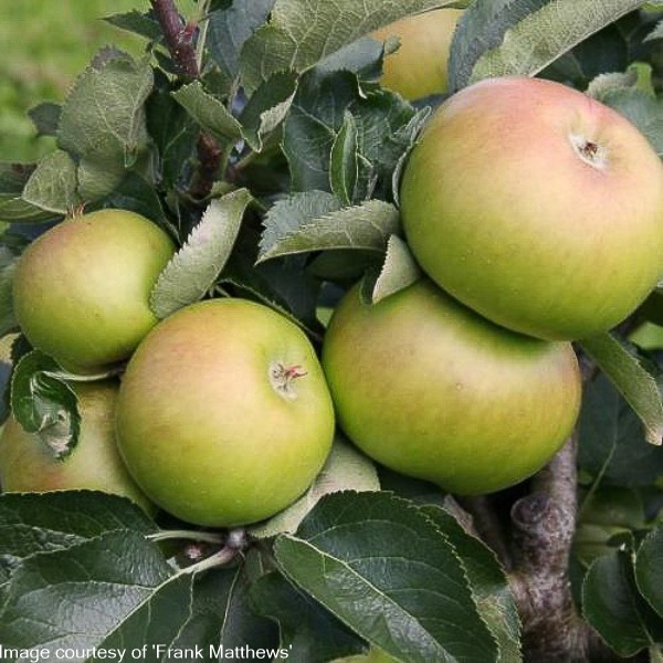 The finest cooker in the world! Green to greenish yellow with a strong acid flavour. A strong grower. Semi vigorous rootstock: Ht 3.5-4 metres in 10 years. Needs two pollinators. Good keeper. Well drained, sheltered, sunny site.
