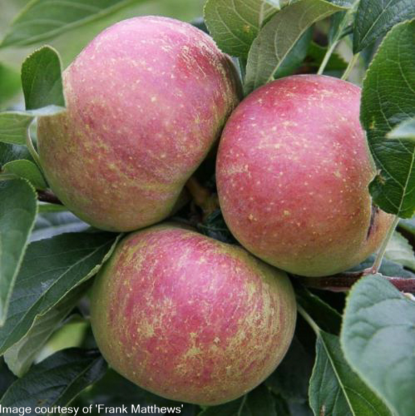Peasgood’s Nonsuch x Cox’s Orange Pippin. An easy to grow apple with orange red flush. Sweet flavoured eater which also bakes well, also good for juicing. Valued garden apple. Pick Sept, keeps until Dec. Good disease resistance. Good for Northern areas. Self fertile. Flowering group 3. Grown on MM106 rootstock: Semi vigorous rootstock: Ht 3.5-4 metres in 10 years.