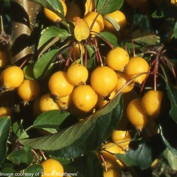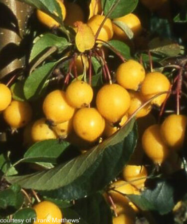 ‘Crab Apple’. A lovely small tree with pretty white blossom in spring followed by a superb display of persistent golden yellow crab apples which last well into winter. Ht: up to 4 – 5 m (13 – 16 ft). Any reasonable soil. Sun or part shade.
